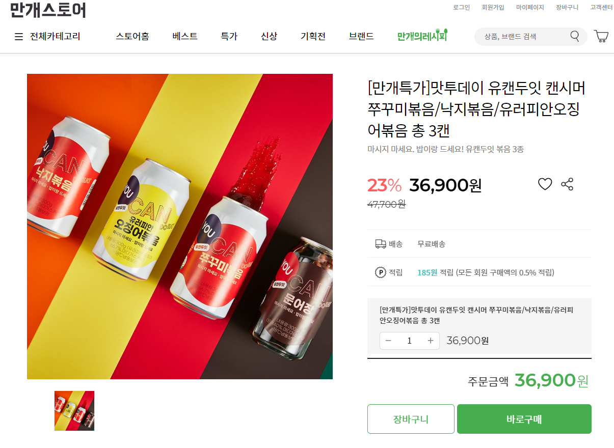 마시지 마세요. 밥이랑 드세요! 맛투데이 유캔두잇 캔시머 쭈꾸미볶음/낙지볶음/유러피안오징어볶음 총 3캔세트는 현재 저렴한가격에 판매하고 있어 더욱 매리트 있는 제품으로 할인이벤트는 기간에 따라 조기마감할 수 있고 예고없이 가격이나 할인율이 변동될 수 있습니다. 망설이면 비싸져요~ 지금사면 저렴하게 득템할 찬스입니다.