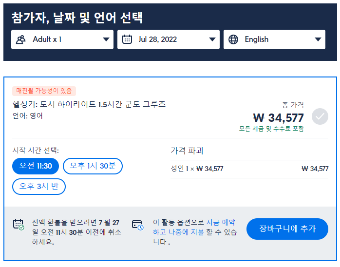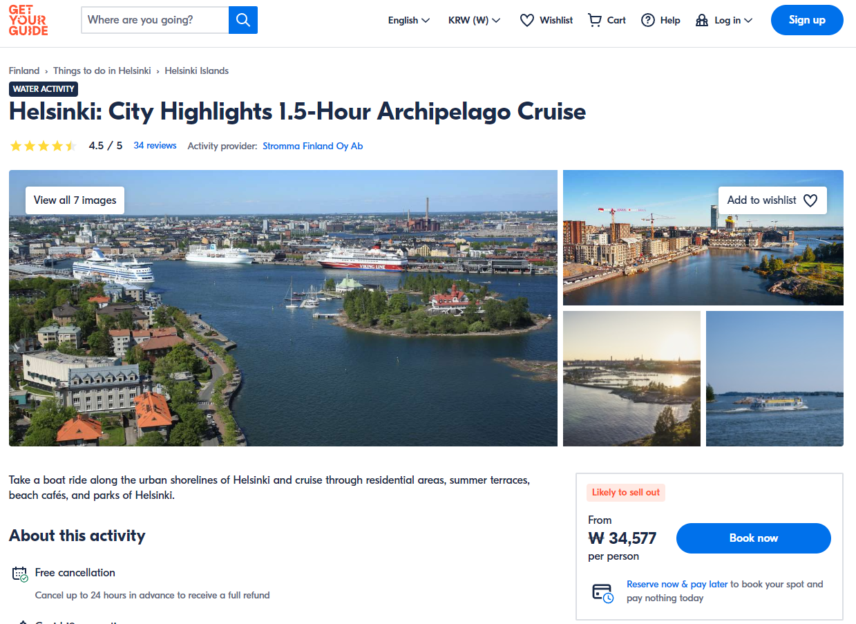 헬싱키 군도 크루즈는 GET YOUR GUIDE 사이트에서 예약하실 수 있습니다. 사이트는 특히 전세계 대부분의 나라, 지역의 투어, 교통편 있어, 쉽게 찾을 수 없는 여행지의 다양한 투어 및 서비스를 이용할 수 있는 글로벌 사이트로 한국어사이트는 지원하지 않습니다. (글로벌 한국어 여행사이트를 찾으신다면 klook 여행사이트 추천합니다. 함께 사용하시면 더욱 편하게 여행하실 수 있습니다. klook에 찾는 정보가 없다면 GET YOUR GUIDE에서 찾으시면 됩니다.)