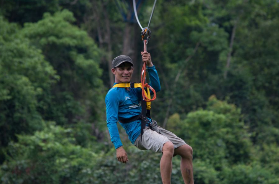 집라인 체험 전에 가이드가 지침과 안전 교육을 안내합니다. 푸른 숲과 강 위로 4,440피트를 날아보세요. 여정은 7개의 노선, 12개의 플랫폼 및 2개의 다리로 구성됩니다.