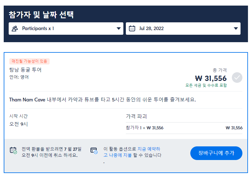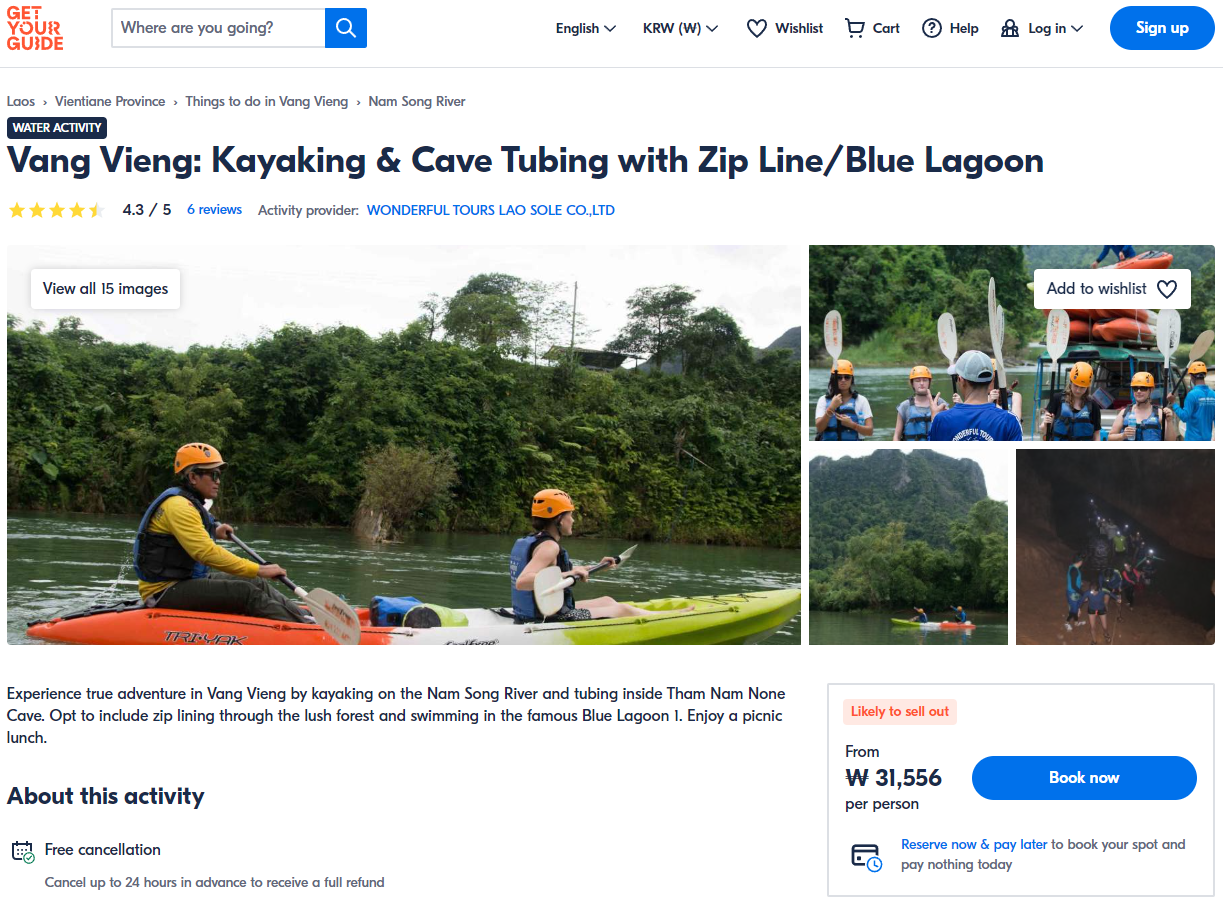 방비엥 블루라군 카약투어는 GET YOUR GUIDE 사이트에서 예약하실 수 있습니다. 사이트는 특히 전세계 대부분의 나라, 지역의 투어, 교통편 있어, 쉽게 찾을 수 없는 여행지의 다양한 투어 및 서비스를 이용할 수 있는 글로벌 사이트로 한국어사이트는 지원하지 않습니다. (글로벌 한국어 여행사이트를 찾으신다면 klook 여행사이트 추천합니다. 함께 사용하시면 더욱 편하게 여행하실 수 있습니다. klook에 찾는 정보가 없다면 GET YOUR GUIDE에서 찾으시면 됩니다.)