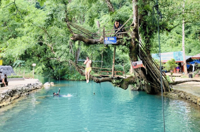 Blue Lagoon 1은 도시에서 가장 유명한 장소 중 하나입니다. 편안히 앉아 휴식을 취하거나 자연 수영장에서 뛰어들어 더위를 식히십시오. 즐거운 하루를 보낸 후 저녁에 방비엥의 호텔로 다시 이동합니다.