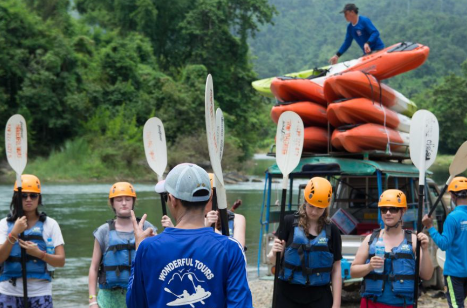 방비엥의 호텔에서 픽업하여 하루 종일 모험을 시작하고 카약 출발 지점인 반비엥 사마이까지 북쪽으로 6마일을 타십시오. 남송강에서 하류로 출발하기 전에 카약 가이드가 패들링 지침을 제공할 것입니다.