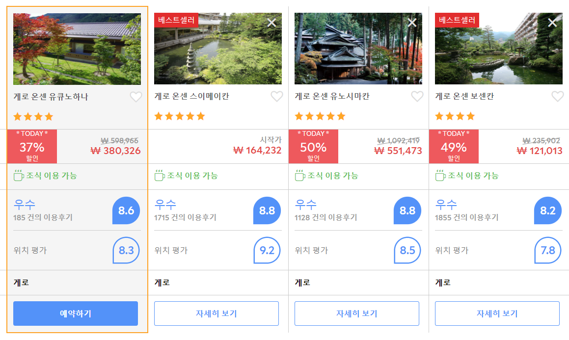 게로 온센 유큐노하나 (Gero Onsen Yukyunohana)의 최저 가격대는 아고다웹사이트에서 할인특가 가격으로 매일매일 변동되며 10만원대부터 다양하게 형성됩니다. 날짜별로 매일 가격이 다르므로 아고다웹사이트 최저가를 확인하시려면 아래 링크를 누르시고 원하는 날짜의 가격대를 선택해야 정확한 가격을 자세히 보실 수 있습니다.