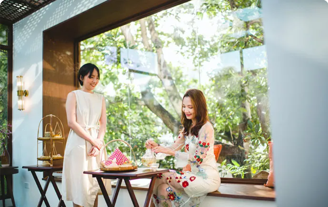 태양의 입맞춤을 환영하는 활짝 열린 유리창을 자랑하는 티룸 존에서는 플로럴 인퓨전 또는 흑찹쌀을 포함한 독특하고 맛있는 아이스크림 맛을 완벽하게 보완하는 섬세하고 전통적인 태국 풍미와 과자인 샴 티 세트를 제공합니다. 맛, 코코넛 밀크 맛을 곁들인 멜론 또는 계절 과일 맛.