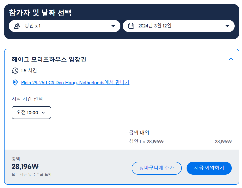헤이그 모리츠하우스 입장권은 GET YOUR GUIDE 사이트에서 예약하실 수 있습니다. 사이트는 특히 전세계 대부분의 나라, 지역의 투어, 교통편 있어, 쉽게 찾을 수 없는 여행지의 다양한 투어 및 서비스를 이용할 수 있는 글로벌 사이트로 한국어사이트는 지원하지 않습니다. (글로벌 한국어 여행사이트를 찾으신다면 klook 여행사이트 추천합니다. 함께 사용하시면 더욱 편하게 여행하실 수 있습니다. klook에 찾는 정보가 없다면 GET YOUR GUIDE에서 찾으시면 됩니다.)
