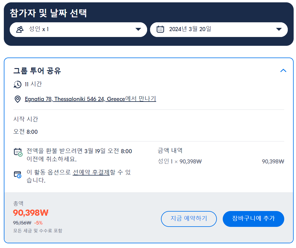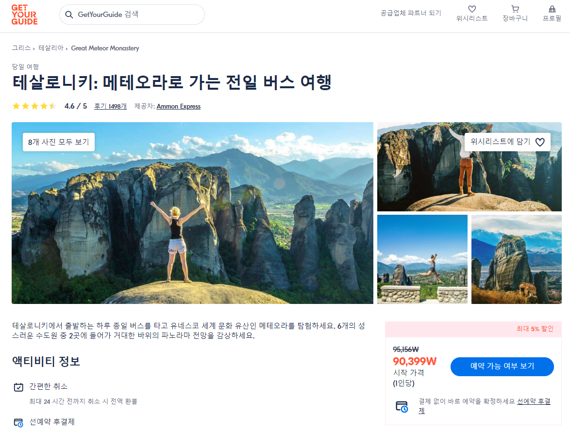 테살로니키출발 메테오라 현지투어는 GET YOUR GUIDE 사이트에서 예약하실 수 있습니다. 사이트는 특히 전세계 대부분의 나라, 지역의 투어, 교통편 있어, 쉽게 찾을 수 없는 여행지의 다양한 투어 및 서비스를 이용할 수 있는 글로벌 사이트로 한국어사이트는 지원하지 않습니다. (글로벌 한국어 여행사이트를 찾으신다면 klook 여행사이트 추천합니다. 함께 사용하시면 더욱 편하게 여행하실 수 있습니다. klook에 찾는 정보가 없다면 GET YOUR GUIDE에서 찾으시면 됩니다.)