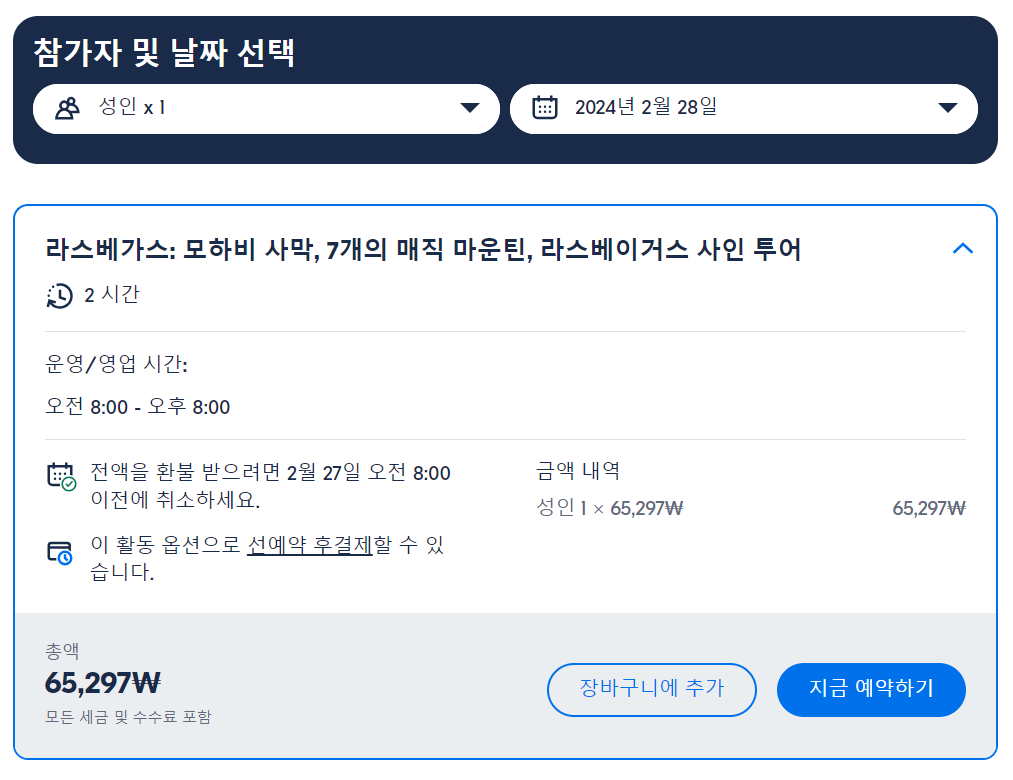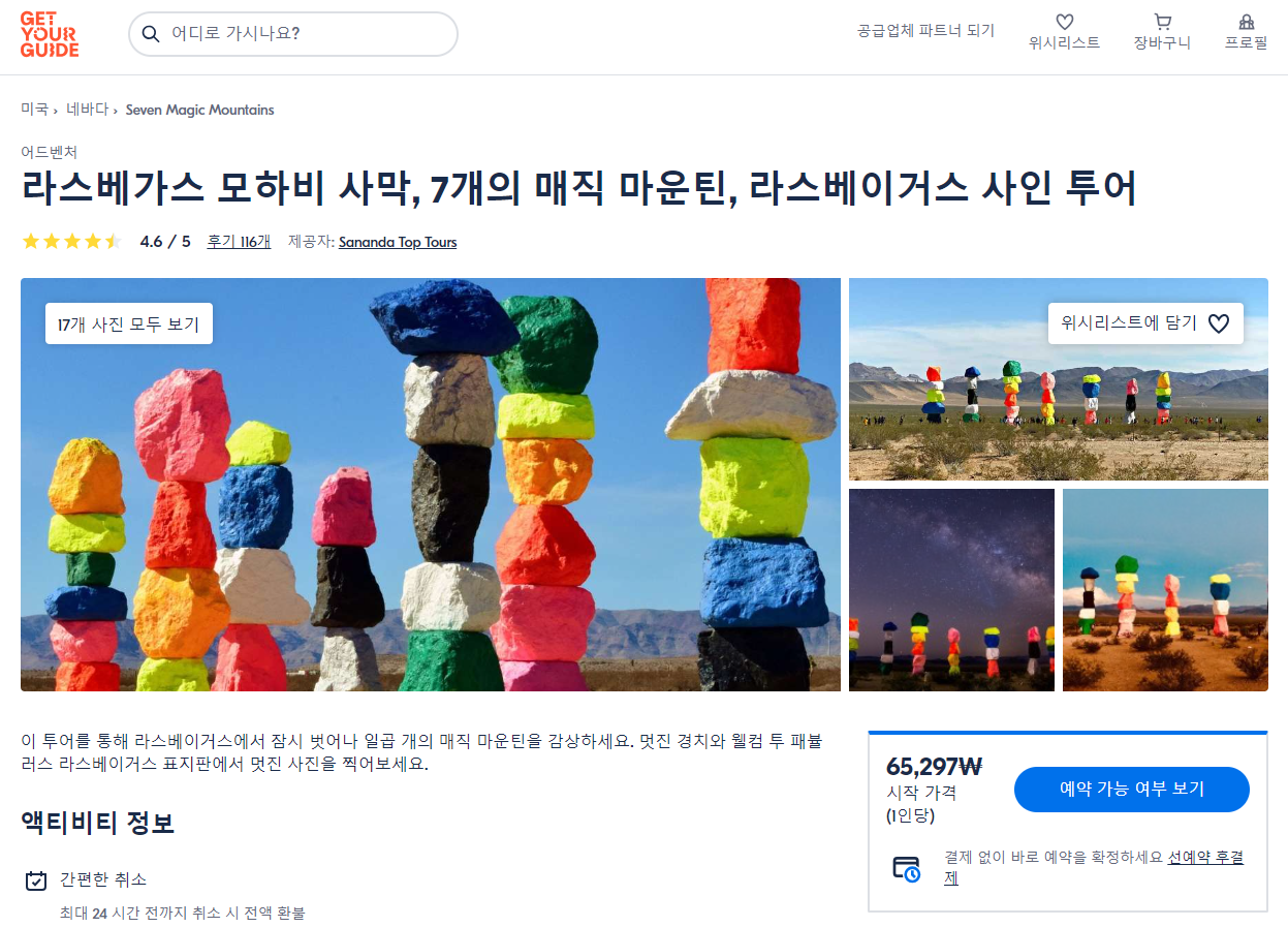 라스베이거스 주요명소 현지투어는 GET YOUR GUIDE 사이트에서 예약하실 수 있습니다. 사이트는 특히 전세계 대부분의 나라, 지역의 투어, 교통편 있어, 쉽게 찾을 수 없는 여행지의 다양한 투어 및 서비스를 이용할 수 있는 글로벌 사이트로 한국어사이트는 지원하지 않습니다. (글로벌 한국어 여행사이트를 찾으신다면 klook 여행사이트 추천합니다. 함께 사용하시면 더욱 편하게 여행하실 수 있습니다. klook에 찾는 정보가 없다면 GET YOUR GUIDE에서 찾으시면 됩니다.)