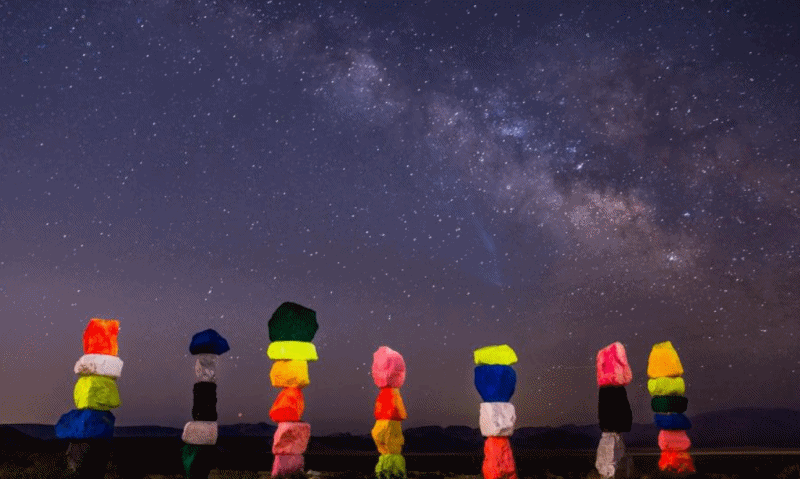 세븐 매직 마운틴(Seven Magic Mountains)은 라스베이거스 남쪽에 위치한 현대미술 조각 작품입니다. 이 작품은 스위스 출신 아티스트 우고 론디노네(Ugo Rondinone)가 2016년에 제작한 것으로, 라스베이거스와 로스앤젤레스 사이의 사막 한가운데서 반짝이는 컬러풀한 물감으로 칠해진 돌탑들이 7개 놓여 있는 풍경을 볼 수 있습니다.