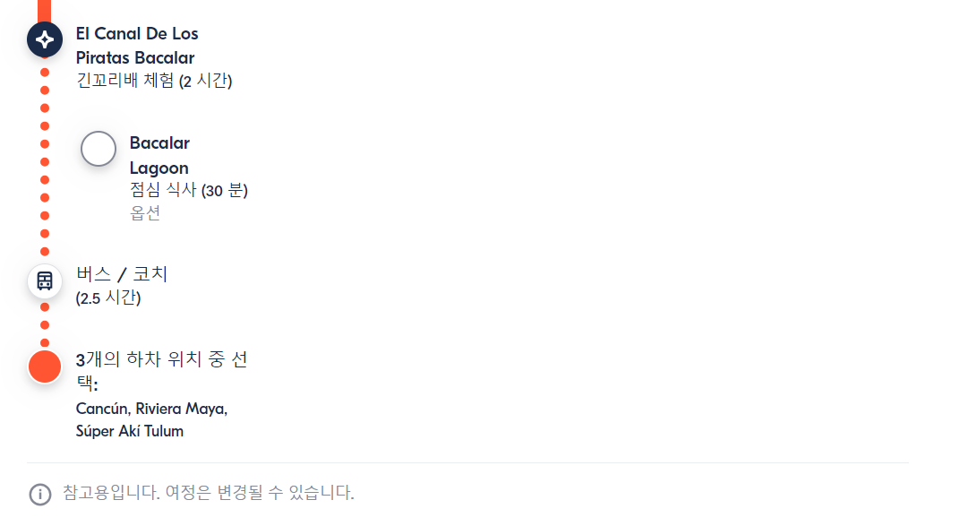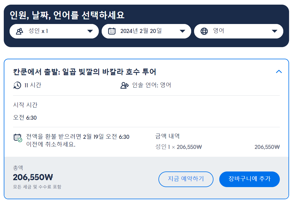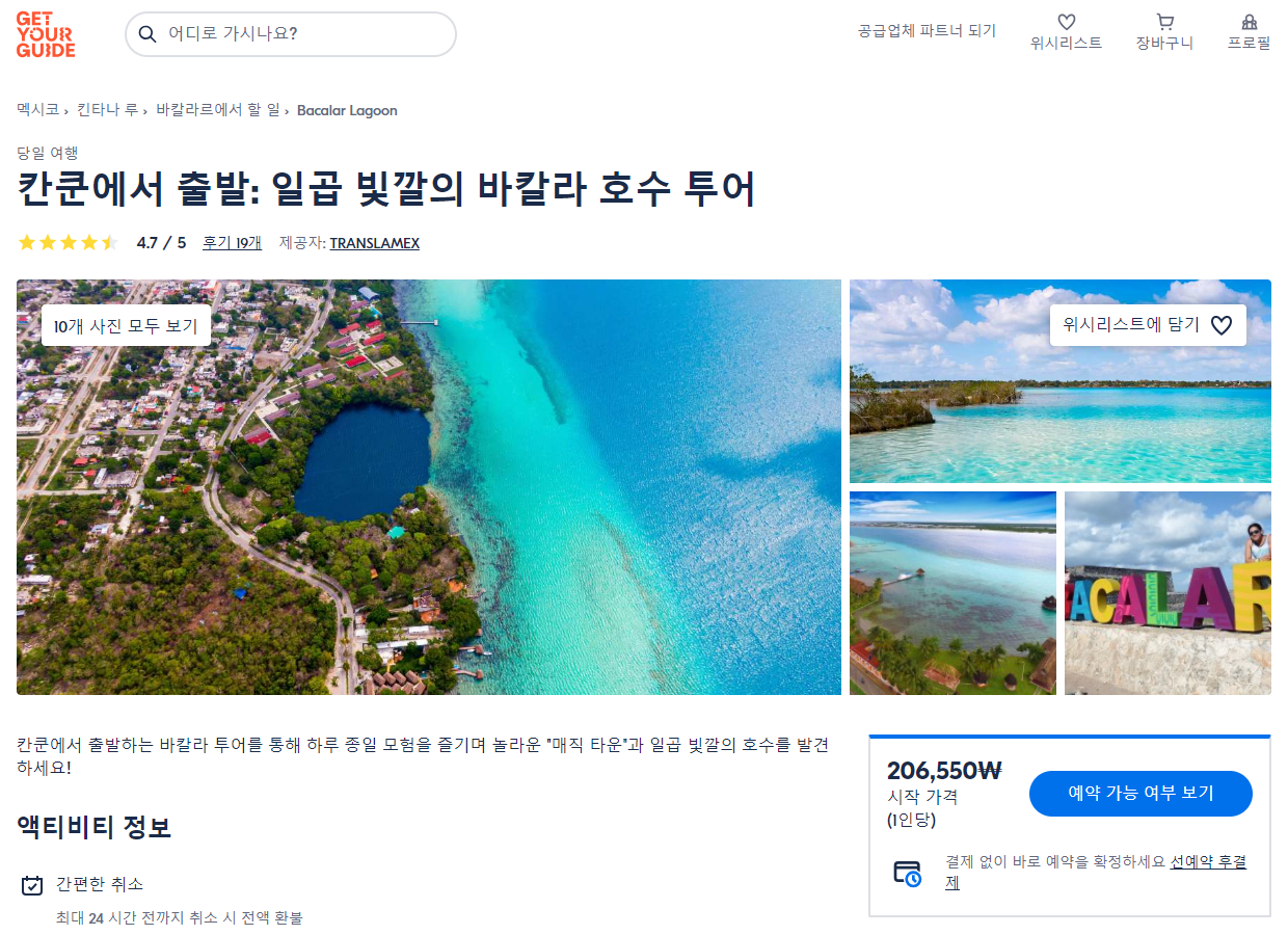 칸쿤에서 출발하는 바칼라 호수 현지투어는 GET YOUR GUIDE 사이트에서 예약하실 수 있습니다. 사이트는 특히 전세계 대부분의 나라, 지역의 투어, 교통편 있어, 쉽게 찾을 수 없는 여행지의 다양한 투어 및 서비스를 이용할 수 있는 글로벌 사이트로 한국어사이트는 지원하지 않습니다. (글로벌 한국어 여행사이트를 찾으신다면 klook 여행사이트 추천합니다. 함께 사용하시면 더욱 편하게 여행하실 수 있습니다. klook에 찾는 정보가 없다면 GET YOUR GUIDE에서 찾으시면 됩니다.)