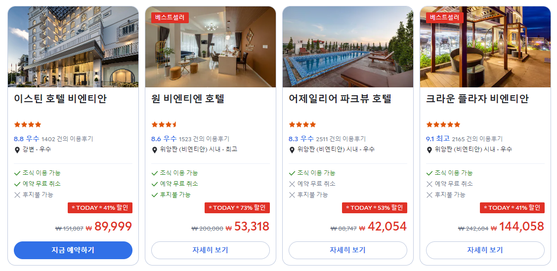 이스틴 호텔 비엔티안 (Eastin Hotel Vientiane)의 최저 가격대는 아고다웹사이트에서 할인특가 가격으로 매일매일 변동되며 10만원대부터 다양하게 형성됩니다. 날짜별로 매일 가격이 다르므로 아고다웹사이트 최저가를 확인하시려면 아래 링크를 누르시고 원하는 날짜의 가격대를 선택해야 정확한 가격을 자세히 보실 수 있습니다.