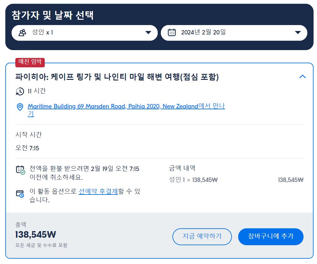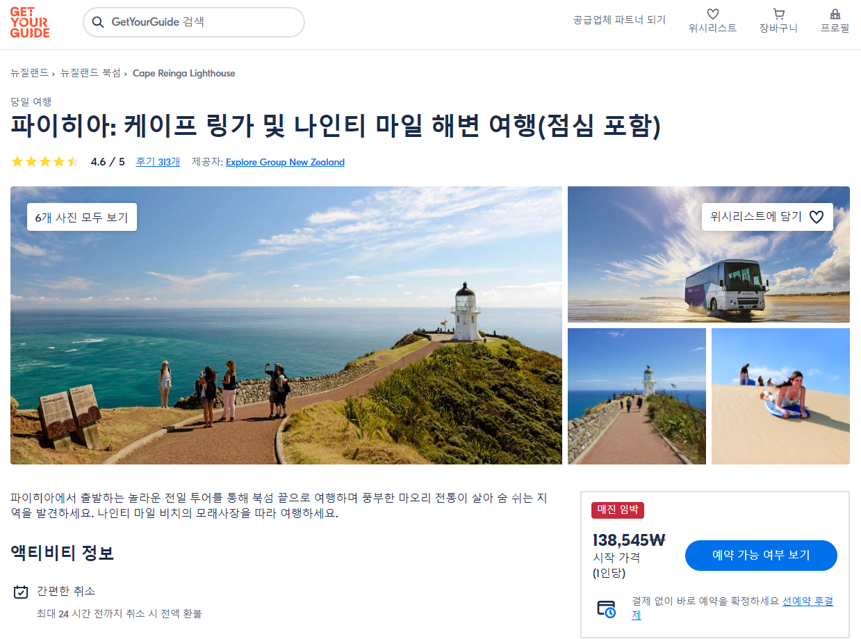 뉴질랜드 파이히아에서 출발하는 케이프 레잉아 등대와 나인티 마일 해변 현지투어는 GET YOUR GUIDE 사이트에서 예약하실 수 있습니다. 사이트는 특히 전세계 대부분의 나라, 지역의 투어, 교통편 있어, 쉽게 찾을 수 없는 여행지의 다양한 투어 및 서비스를 이용할 수 있는 글로벌 사이트로 한국어사이트는 지원하지 않습니다. (글로벌 한국어 여행사이트를 찾으신다면 klook 여행사이트 추천합니다. 함께 사용하시면 더욱 편하게 여행하실 수 있습니다. klook에 찾는 정보가 없다면 GET YOUR GUIDE에서 찾으시면 됩니다.)