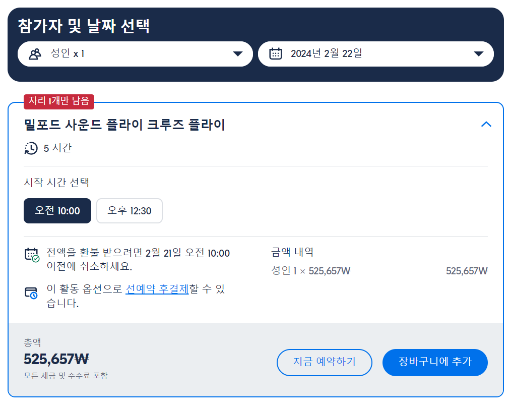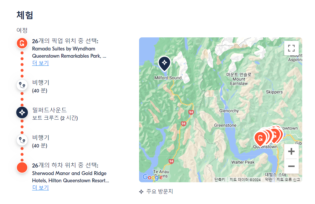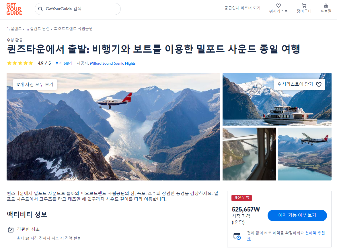퀸스타운에서 출발하는 비행기와 보트를 이용한 밀포드 사운드 현지투어는 GET YOUR GUIDE 사이트에서 예약하실 수 있습니다. 사이트는 특히 전세계 대부분의 나라, 지역의 투어, 교통편 있어, 쉽게 찾을 수 없는 여행지의 다양한 투어 및 서비스를 이용할 수 있는 글로벌 사이트로 한국어사이트는 지원하지 않습니다. (글로벌 한국어 여행사이트를 찾으신다면 klook 여행사이트 추천합니다. 함께 사용하시면 더욱 편하게 여행하실 수 있습니다. klook에 찾는 정보가 없다면 GET YOUR GUIDE에서 찾으시면 됩니다.)