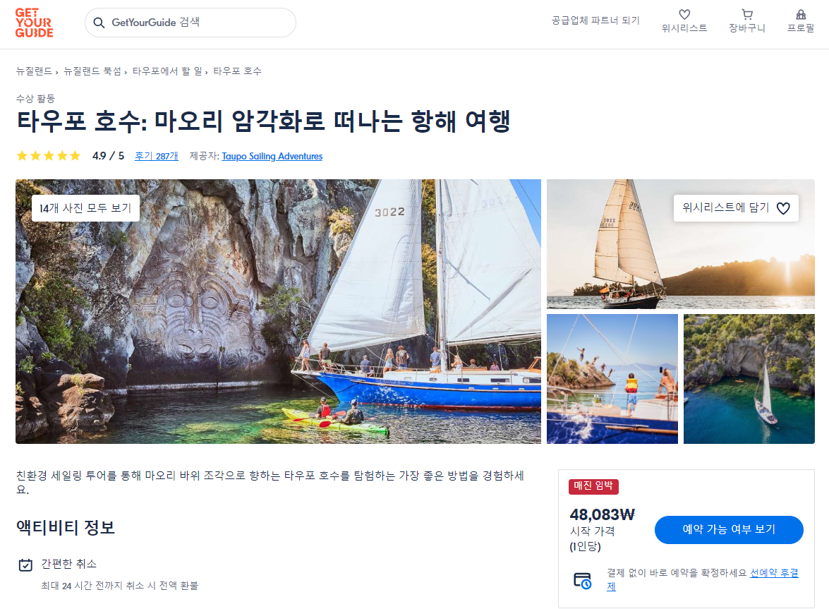 타우포 호수 마오리 암각화 코스 세일링 관광 현지투어추천는 GET YOUR GUIDE 사이트에서 예약하실 수 있습니다. 사이트는 특히 전세계 대부분의 나라, 지역의 투어, 교통편 있어, 쉽게 찾을 수 없는 여행지의 다양한 투어 및 서비스를 이용할 수 있는 글로벌 사이트로 한국어사이트는 지원하지 않습니다. (글로벌 한국어 여행사이트를 찾으신다면 klook 여행사이트 추천합니다. 함께 사용하시면 더욱 편하게 여행하실 수 있습니다. klook에 찾는 정보가 없다면 GET YOUR GUIDE에서 찾으시면 됩니다.)