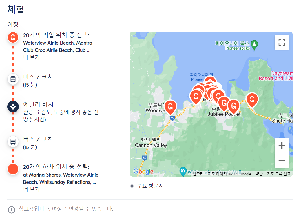 - 투어는 휘트선데이 공항 - 슈트 하버(에어리 비치 메인 스트리트에서 8분 거리)에서 매일 출발합니다. - 항공권에는 예정된 픽업 시간이 아닌 항공편 출발 시간이 표시된다는 점에 유의하시기 바랍니다. 투어 제공업체에 전화하여 픽업 시간과 위치를 다시 확인하시기 바랍니다.