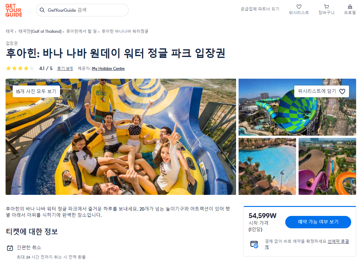후아힌 바나 나바 원데이 워터 정글 파크 입장권은 GET YOUR GUIDE 사이트에서 예약하실 수 있습니다. 사이트는 특히 전세계 대부분의 나라, 지역의 투어, 교통편 있어, 쉽게 찾을 수 없는 여행지의 다양한 투어 및 서비스를 이용할 수 있는 글로벌 사이트로 한국어사이트는 지원하지 않습니다. (글로벌 한국어 여행사이트를 찾으신다면 klook 여행사이트 추천합니다. 함께 사용하시면 더욱 편하게 여행하실 수 있습니다. klook에 찾는 정보가 없다면 GET YOUR GUIDE에서 찾으시면 됩니다.)