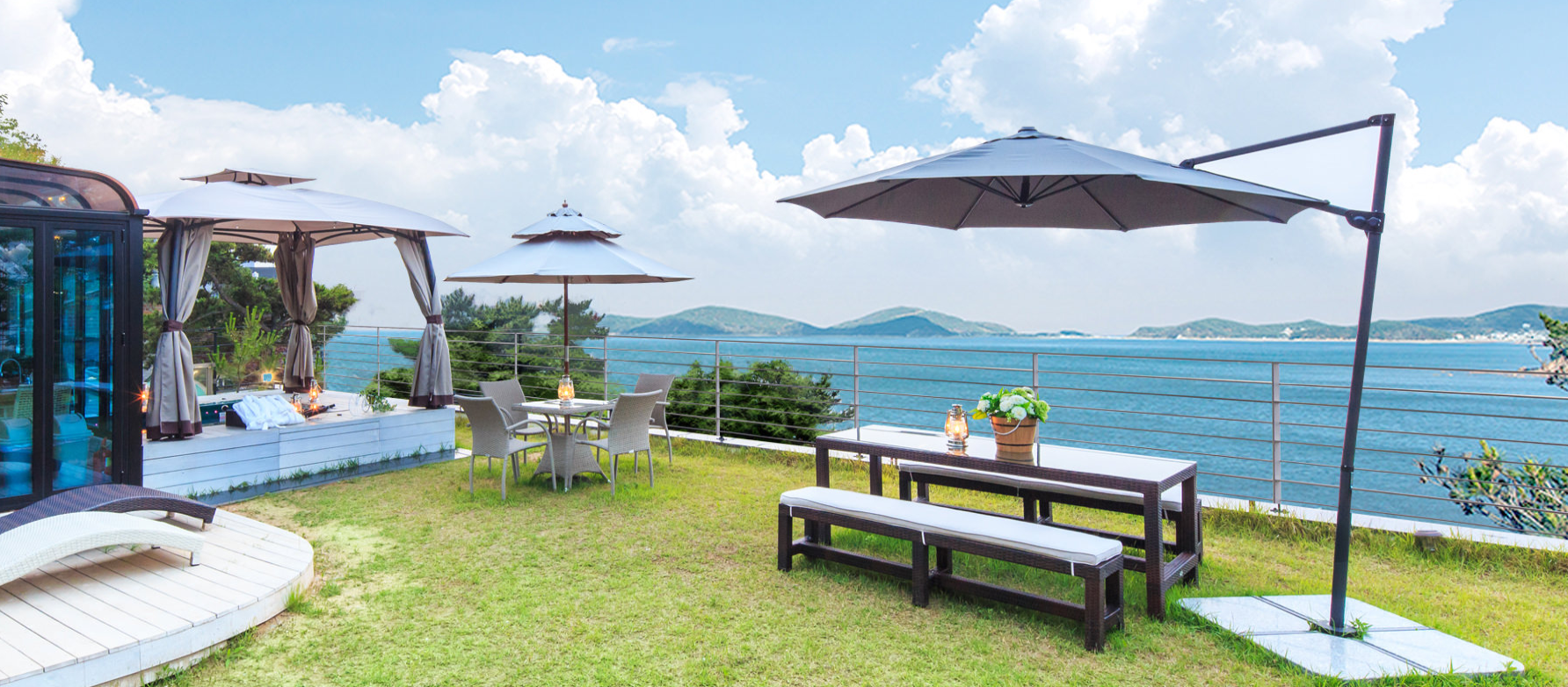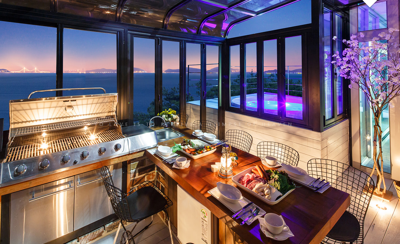 바다를 바라보며 가족들과 시선을 마주보며 식사할 수 있는 각도까지도 세밀하게 신경을 쓴 바비큐 장에서