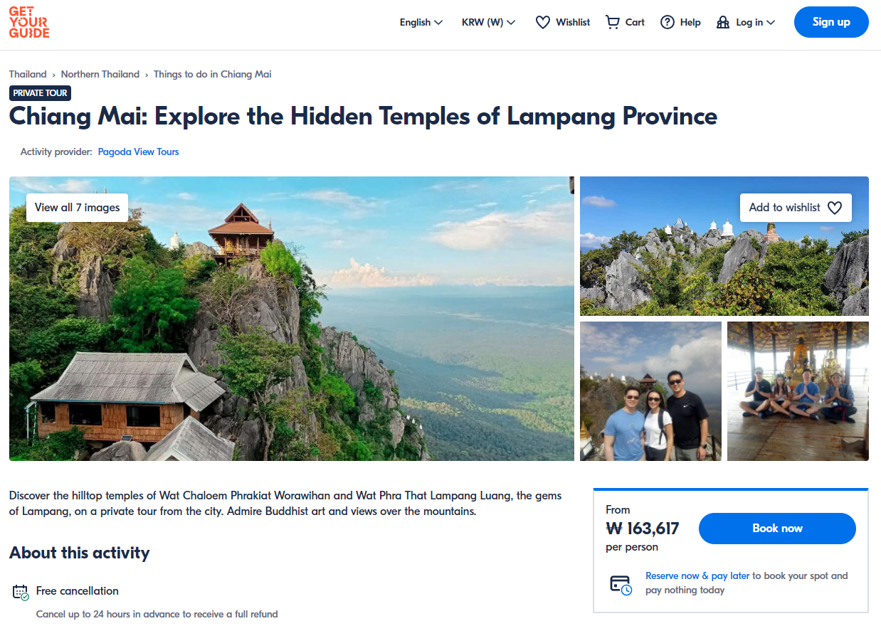 치앙마이출발 람팡 주의 숨겨진 사원 탐험 프라이빗투어는 GET YOUR GUIDE 사이트에서 예약하실 수 있습니다. 사이트는 특히 전세계 대부분의 나라, 지역의 투어, 교통편 있어, 쉽게 찾을 수 없는 여행지의 다양한 투어 및 서비스를 이용할 수 있는 글로벌 사이트로 한국어사이트는 지원하지 않습니다. (글로벌 한국어 여행사이트를 찾으신다면 klook 여행사이트 추천합니다. 함께 사용하시면 더욱 편하게 여행하실 수 있습니다. klook에 찾는 정보가 없다면 GET YOUR GUIDE에서 찾으시면 됩니다.)