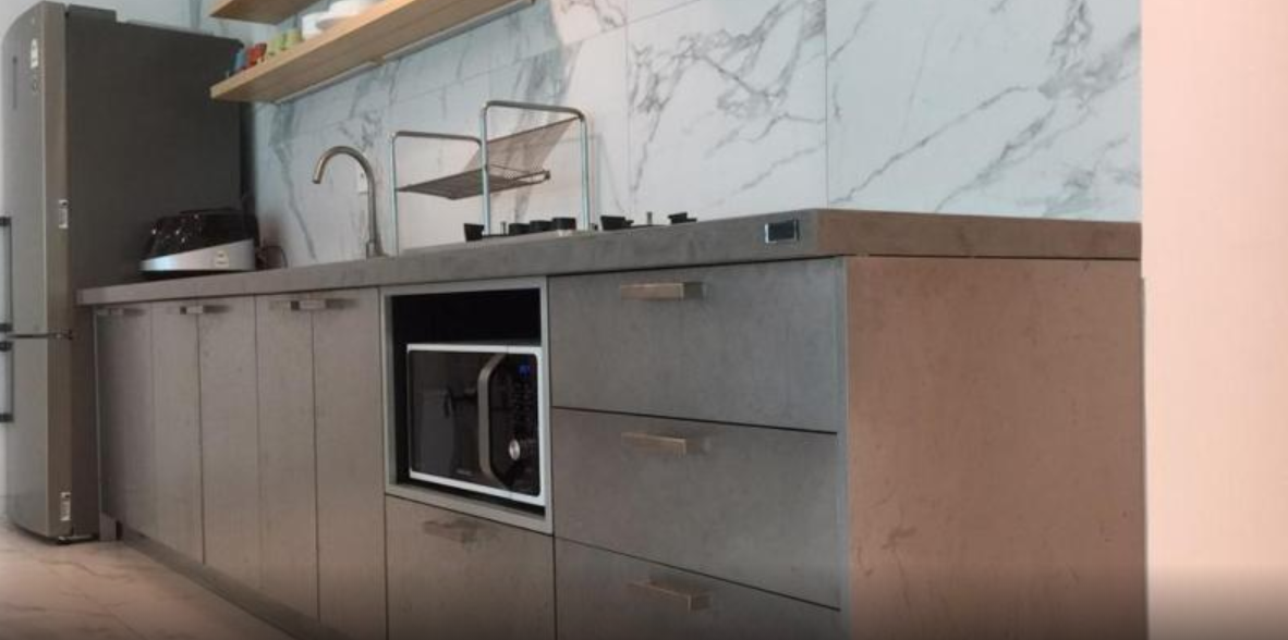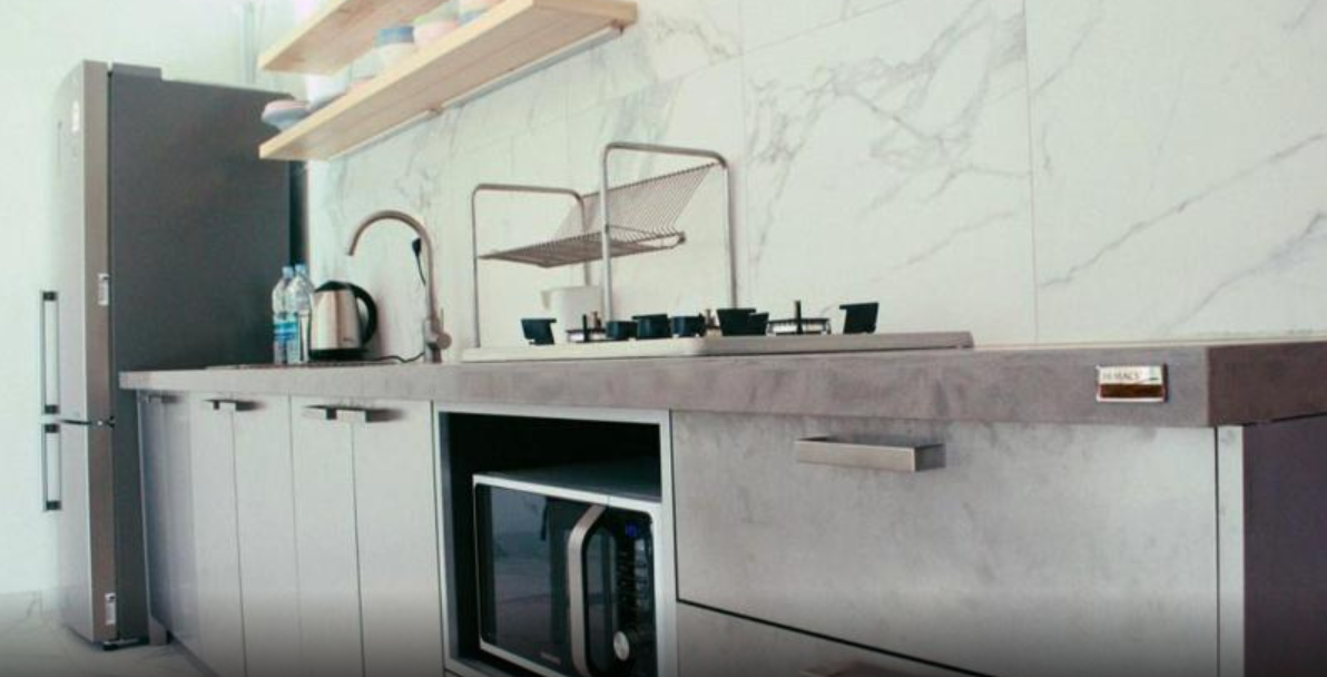 거실, 다양한 주방 시설과 욕실 1개가 있습니다.