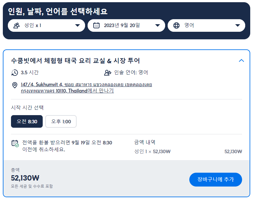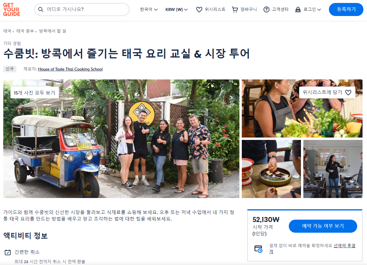 방콕 수쿰빗에서 즐기는 태국 요리 교실 & 시장 투어는 GET YOUR GUIDE 사이트에서 예약하실 수 있습니다. 사이트는 특히 전세계 대부분의 나라, 지역의 투어, 교통편 있어, 쉽게 찾을 수 없는 여행지의 다양한 투어 및 서비스를 이용할 수 있는 글로벌 사이트로 한국어사이트는 지원하지 않습니다. (글로벌 한국어 여행사이트를 찾으신다면 klook 여행사이트 추천합니다. 함께 사용하시면 더욱 편하게 여행하실 수 있습니다. klook에 찾는 정보가 없다면 GET YOUR GUIDE에서 찾으시면 됩니다.)