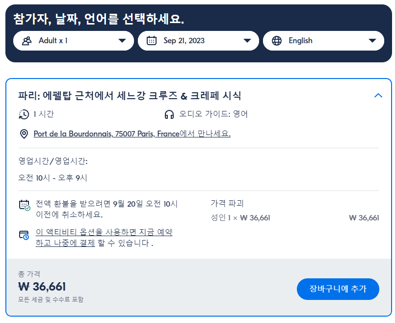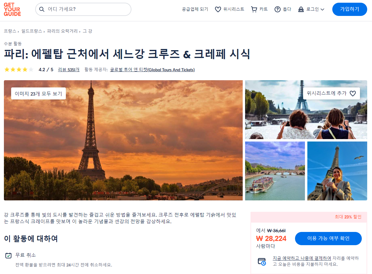 파리 에펠탑 근처에서 세느강 크루즈 & 크레페 시식(Paris Seine Cruise & Crepe Tasting near the Eiffel Tower)은 GET YOUR GUIDE 사이트에서 예약하실 수 있습니다. 사이트는 특히 전세계 대부분의 나라, 지역의 투어, 교통편 있어, 쉽게 찾을 수 없는 여행지의 다양한 투어 및 서비스를 이용할 수 있는 글로벌 사이트로 한국어사이트는 지원하지 않습니다. (글로벌 한국어 여행사이트를 찾으신다면 klook 여행사이트 추천합니다. 함께 사용하시면 더욱 편하게 여행하실 수 있습니다. klook에 찾는 정보가 없다면 GET YOUR GUIDE에서 찾으시면 됩니다.)