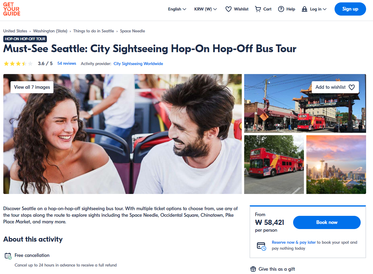 시애틀 시티 관광 홉온 홉오프 버스 투어 티켓은 GET YOUR GUIDE 사이트에서 예약하실 수 있습니다. 사이트는 특히 전세계 대부분의 나라, 지역의 투어, 교통편 있어, 쉽게 찾을 수 없는 여행지의 다양한 투어 및 서비스를 이용할 수 있는 글로벌 사이트로 한국어사이트는 지원하지 않습니다. (글로벌 한국어 여행사이트를 찾으신다면 klook 여행사이트 추천합니다. 함께 사용하시면 더욱 편하게 여행하실 수 있습니다. klook에 찾는 정보가 없다면 GET YOUR GUIDE에서 찾으시면 됩니다.)