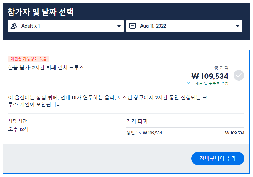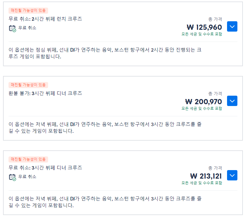 보스턴 점심 또는 저녁 식사 크루즈는 GET YOUR GUIDE 사이트에서 예약하실 수 있습니다. 사이트는 특히 전세계 대부분의 나라, 지역의 투어, 교통편 있어, 쉽게 찾을 수 없는 여행지의 다양한 투어 및 서비스를 이용할 수 있는 글로벌 사이트로 한국어사이트는 지원하지 않습니다. (글로벌 한국어 여행사이트를 찾으신다면 klook 여행사이트 추천합니다. 함께 사용하시면 더욱 편하게 여행하실 수 있습니다. klook에 찾는 정보가 없다면 GET YOUR GUIDE에서 찾으시면 됩니다.)