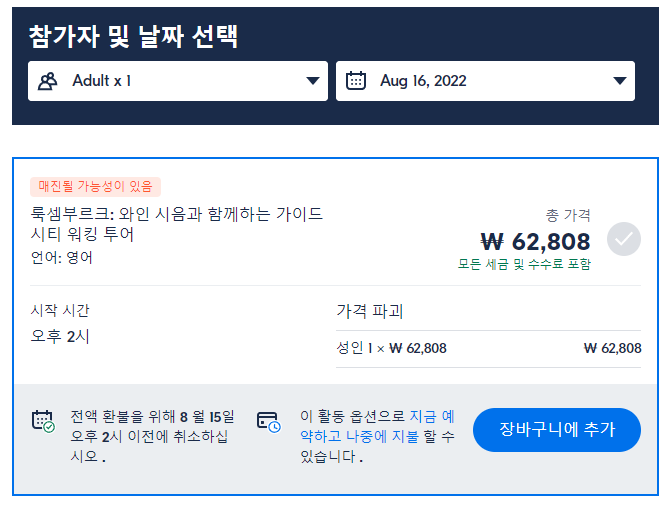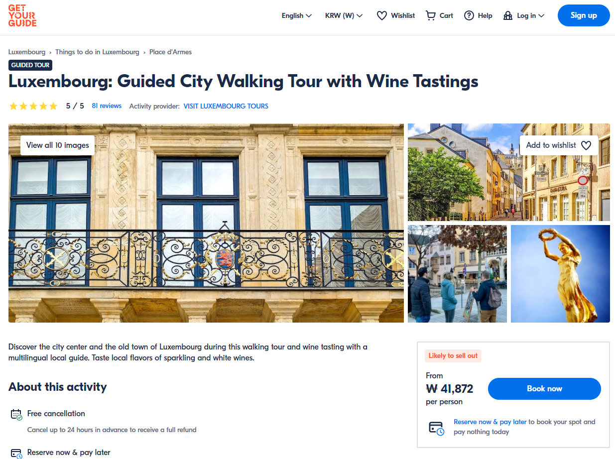 룩셈부르크 와인 시음과 함께하는 가이드 시티 워킹 투어는 GET YOUR GUIDE 사이트에서 예약하실 수 있습니다. 사이트는 특히 전세계 대부분의 나라, 지역의 투어, 교통편 있어, 쉽게 찾을 수 없는 여행지의 다양한 투어 및 서비스를 이용할 수 있는 글로벌 사이트로 한국어사이트는 지원하지 않습니다. (글로벌 한국어 여행사이트를 찾으신다면 klook 여행사이트 추천합니다. 함께 사용하시면 더욱 편하게 여행하실 수 있습니다. klook에 찾는 정보가 없다면 GET YOUR GUIDE에서 찾으시면 됩니다.)