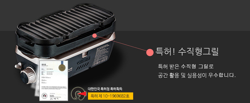 특허 받은 수직형 그릴로 공간 활용 및 실용성이 우수합니다. 또한 부탄가스를 하부에 장착하는 방식으로 설계되어 가스 소비량을 줄였습니다.