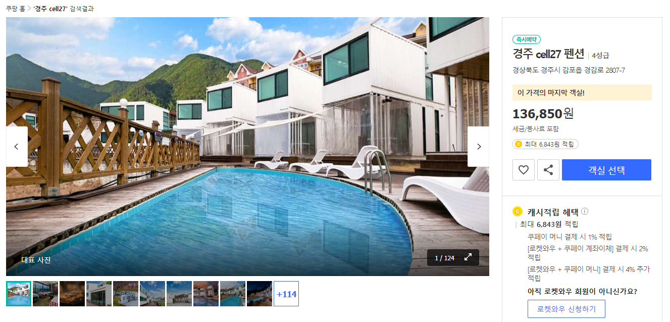 CELL27 경주펜션은 쿠팡에서 13만원대에 예약이 가능하며