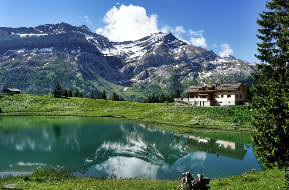 스위스를 여행하며 스위스 샬레 마을의 그림 같은 이미지를 직접 탐험해 보세요. 알프스 보두아즈(Alps Vaudoises)의 중심부에 있는 레디아블레(Les Diablerets)를 참조하십시오.