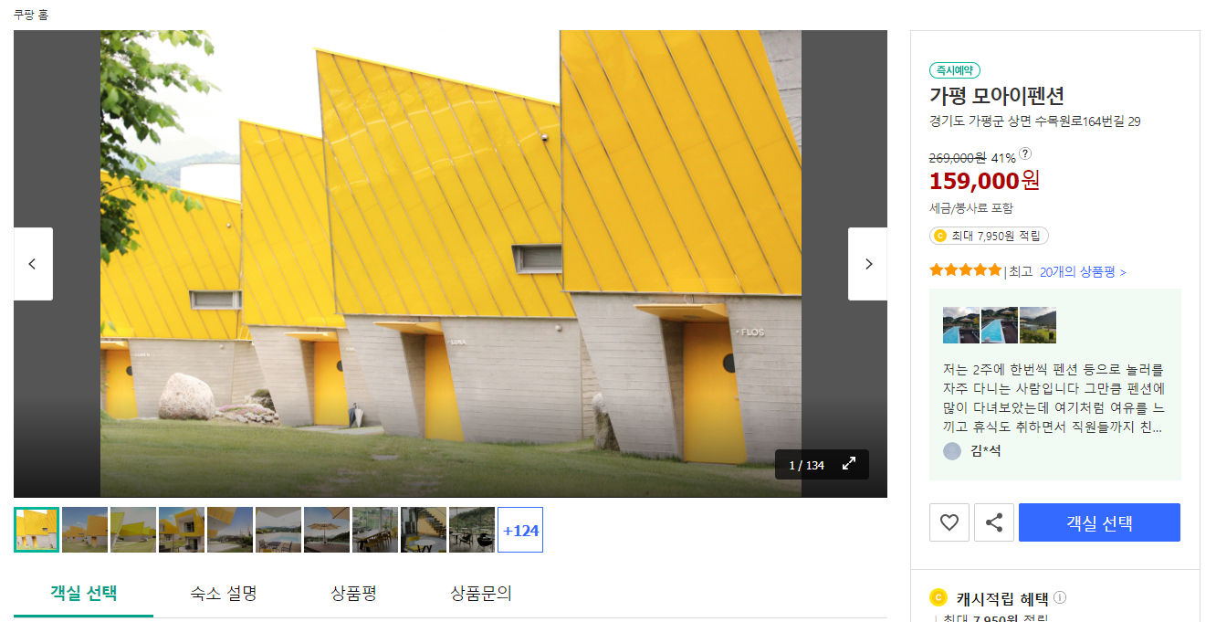 쿠팡사이트에서 가평 모아이펜션을 검색하시면 쉽게 확인하실 수 있습니다.