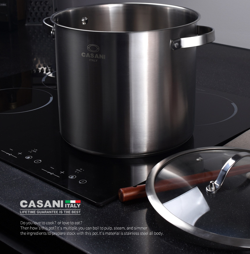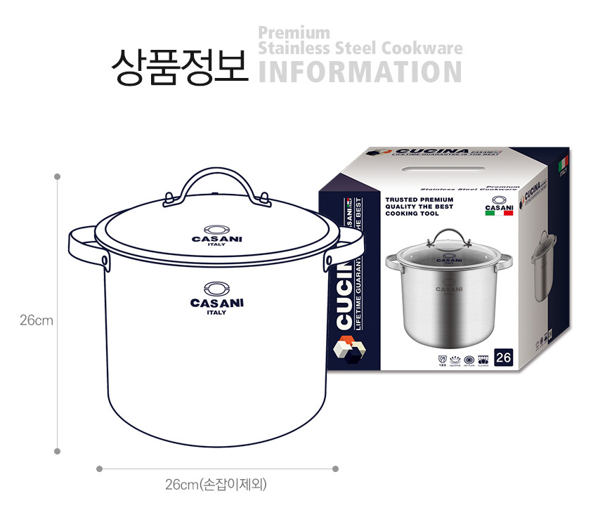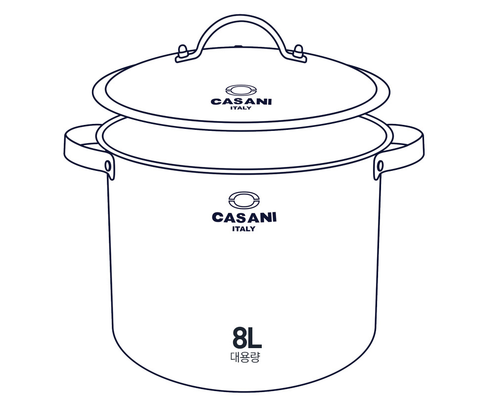프리미엄 스텐레스 스틸 쿡웨어 이태리 까사니 쿠치나 하이 곰솥은 전체 바디에 고 품질 스텐레스를 사용하고 있으며 기존 곰솥보다 높이를 높여 더 많은 양(8L)의 요리시에도 편리하게 사용할 수 있도록 제작 되었습니다. 어떤 주방에도 어울리는 모던한 디자인으로 손잡이의 그립감이 우수하고 유리뚜껑을 사용하여 요리가 완성되어가는 과정을 눈으로 확인 할수 있는 즐거움이 있습니다