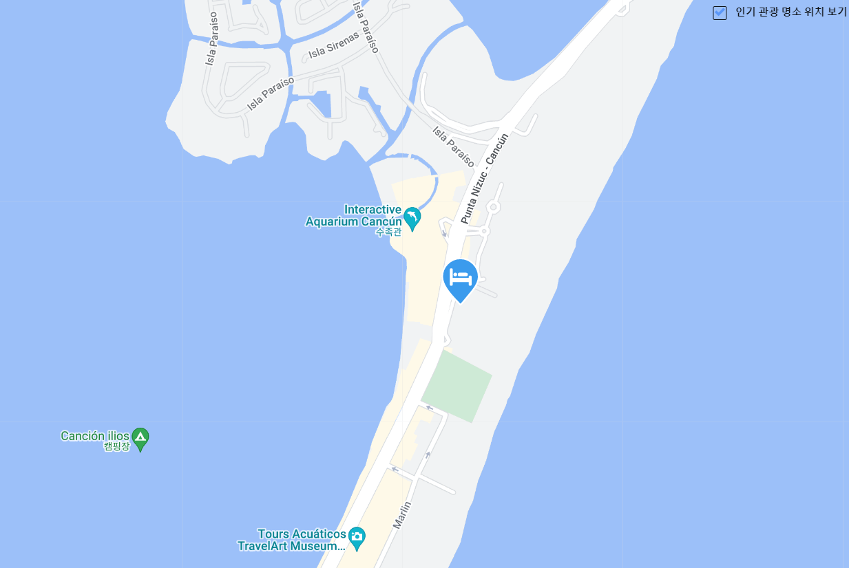칸쿤여행의 성인전용의 올인클루시브 객실의 라이브 아쿠아 비치 리조트 칸쿤(Live Aqua Beach Resort Cancun)은 칸쿤의 호텔존에서 비교적 초입이라 셔틀타고 오랫동안 들어가지 않아도 되는 위치로 공항에서 택시로 40분 거리로 가까운 편이었고, 라이슬라 쇼핑몰이 가까이에 있습니다.