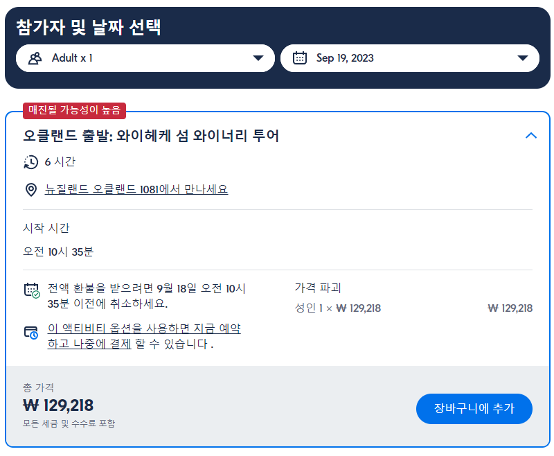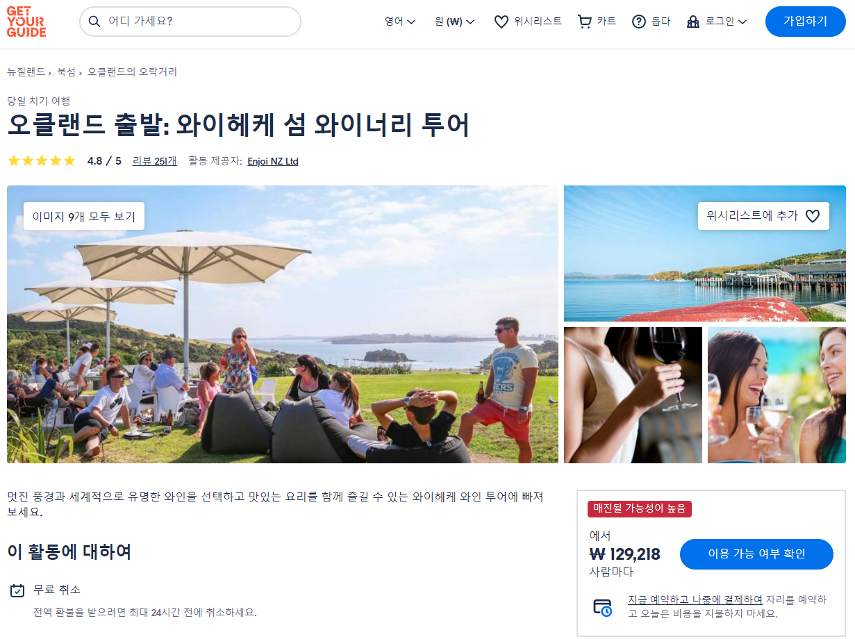 오클랜드출발 와이헤케 섬 와이너리 투어 (Waiheke Island Wineries' Tour From Auckland)는 GET YOUR GUIDE 사이트에서 예약하실 수 있습니다. 사이트는 특히 전세계 대부분의 나라, 지역의 투어, 교통편 있어, 쉽게 찾을 수 없는 여행지의 다양한 투어 및 서비스를 이용할 수 있는 글로벌 사이트로 한국어사이트는 지원하지 않습니다. (글로벌 한국어 여행사이트를 찾으신다면 klook 여행사이트 추천합니다. 함께 사용하시면 더욱 편하게 여행하실 수 있습니다. klook에 찾는 정보가 없다면 GET YOUR GUIDE에서 찾으시면 됩니다.)