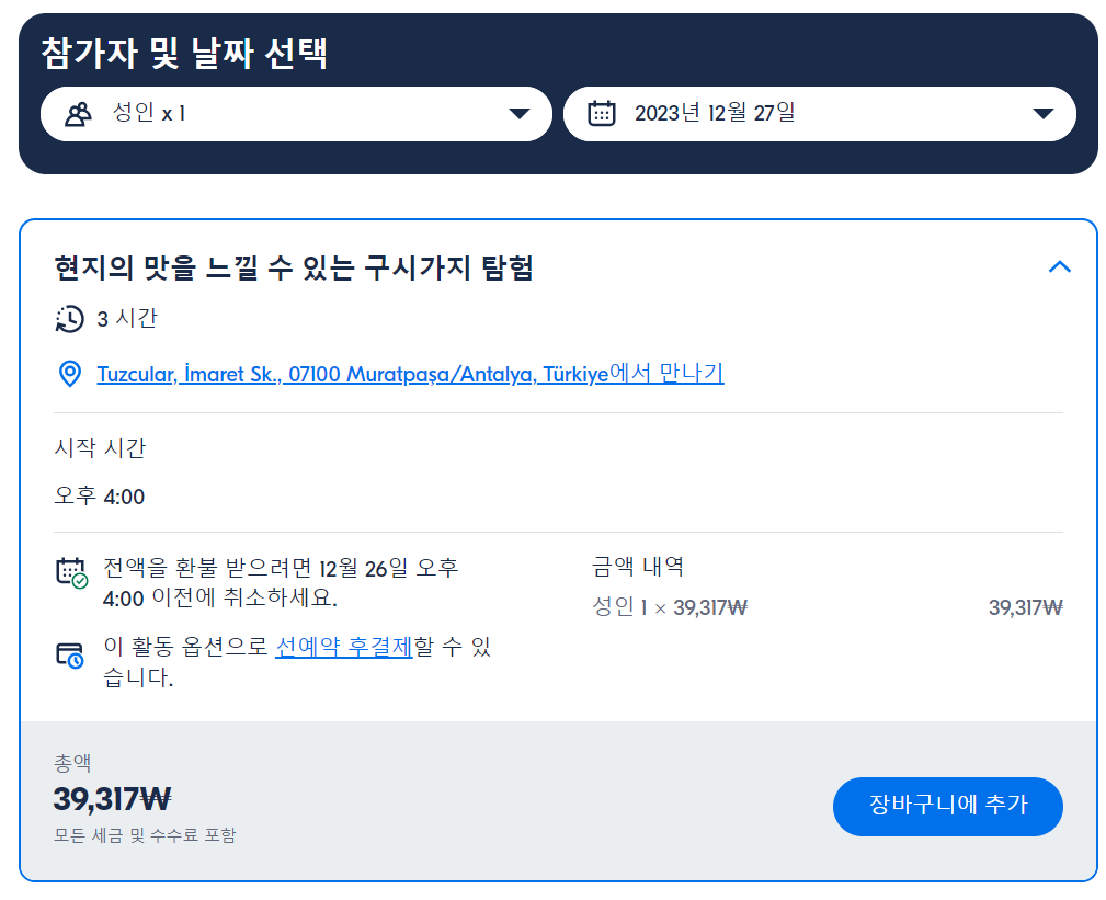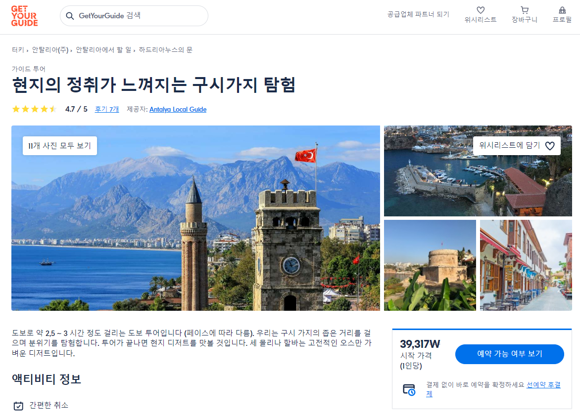 안탈리아 올드타운(칼레이시) 현지투어는 GET YOUR GUIDE 사이트에서 예약하실 수 있습니다. 사이트는 특히 전세계 대부분의 나라, 지역의 투어, 교통편 있어, 쉽게 찾을 수 없는 여행지의 다양한 투어 및 서비스를 이용할 수 있는 글로벌 사이트로 한국어사이트는 지원하지 않습니다. (글로벌 한국어 여행사이트를 찾으신다면 klook 여행사이트 추천합니다. 함께 사용하시면 더욱 편하게 여행하실 수 있습니다. klook에 찾는 정보가 없다면 GET YOUR GUIDE에서 찾으시면 됩니다.)
