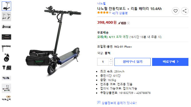 나노휠 전동킥보드 최신버젼은 쿠팡에서 398,000원에 구매하실 수 있으며
