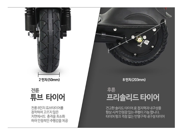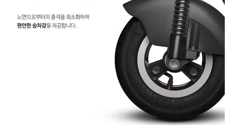 8인치 튜브타이어와유압식 서스펜션의 조합으로 편안하고 안정적인 주행을 할수있으며 주행중 발행하는 급가속, 급제동, 급선회에서도 서스펜션이 있어 더욱더 안전한 주행에 도움을 줍니다.