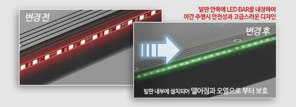 발판 안쪽에 LED BAR를 내장하여 야간 주행시 안전성과 고급스러운 디자인과 발판 내부에 설치되어 떨어짐과 오염으로부터 보호