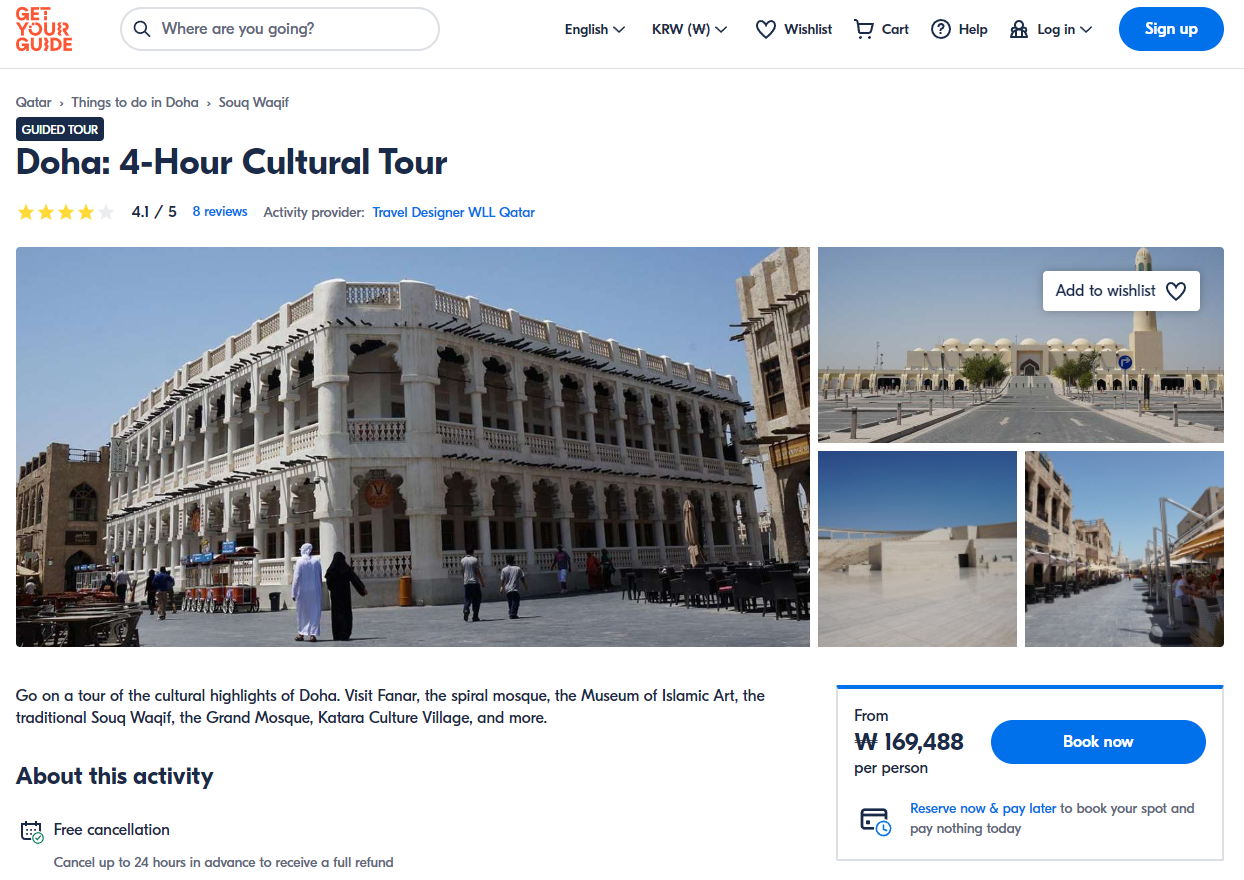 도하 4시간 문화 투어는 GET YOUR GUIDE 사이트에서 예약하실 수 있습니다. 사이트는 특히 전세계 대부분의 나라, 지역의 투어, 교통편 있어, 쉽게 찾을 수 없는 여행지의 다양한 투어 및 서비스를 이용할 수 있는 글로벌 사이트로 한국어사이트는 지원하지 않습니다. (글로벌 한국어 여행사이트를 찾으신다면 klook 여행사이트 추천합니다. 함께 사용하시면 더욱 편하게 여행하실 수 있습니다. klook에 찾는 정보가 없다면 GET YOUR GUIDE에서 찾으시면 됩니다.)