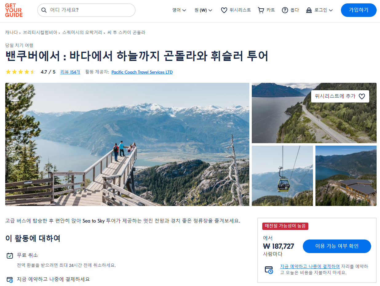 밴쿠버에서 바다에서 하늘까지 곤돌라와 휘슬러 투어(Sea to Sky Gondola and Whistler Tour From Vancouver)는 GET YOUR GUIDE 사이트에서 예약하실 수 있습니다. 사이트는 특히 전세계 대부분의 나라, 지역의 투어, 교통편 있어, 쉽게 찾을 수 없는 여행지의 다양한 투어 및 서비스를 이용할 수 있는 글로벌 사이트로 한국어사이트는 지원하지 않습니다. (글로벌 한국어 여행사이트를 찾으신다면 klook 여행사이트 추천합니다. 함께 사용하시면 더욱 편하게 여행하실 수 있습니다. klook에 찾는 정보가 없다면 GET YOUR GUIDE에서 찾으시면 됩니다.)