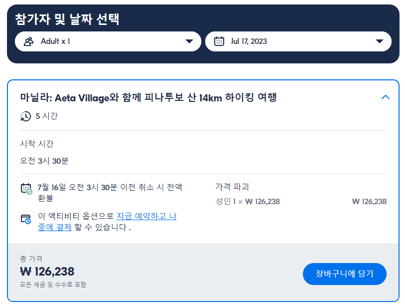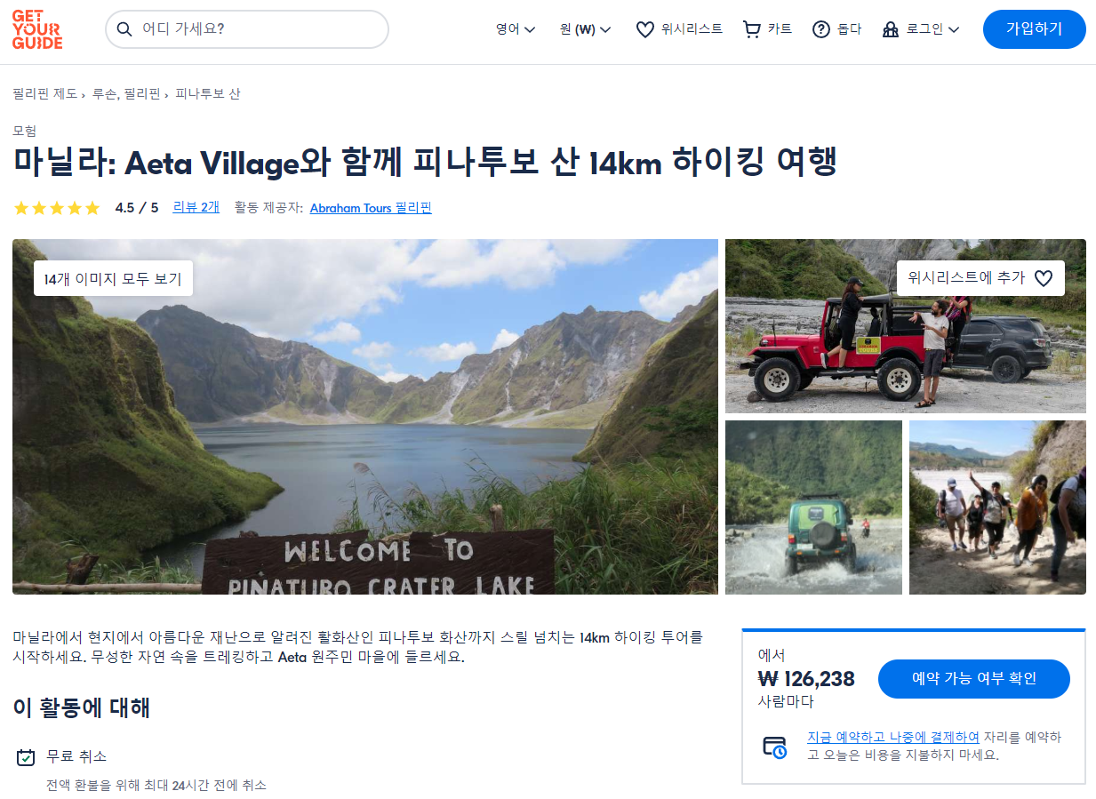 마닐라 Aeta 원주민마을 포함 피나투보산 14km 하이킹 여행(Manila Mount Pinatubo 14Km Hiking Trip with Aeta Village)는 GET YOUR GUIDE 사이트에서 예약하실 수 있습니다. 사이트는 특히 전세계 대부분의 나라, 지역의 투어, 교통편 있어, 쉽게 찾을 수 없는 여행지의 다양한 투어 및 서비스를 이용할 수 있는 글로벌 사이트로 한국어사이트는 지원하지 않습니다. (글로벌 한국어 여행사이트를 찾으신다면 klook 여행사이트 추천합니다. 함께 사용하시면 더욱 편하게 여행하실 수 있습니다. klook에 찾는 정보가 없다면 GET YOUR GUIDE에서 찾으시면 됩니다.)
