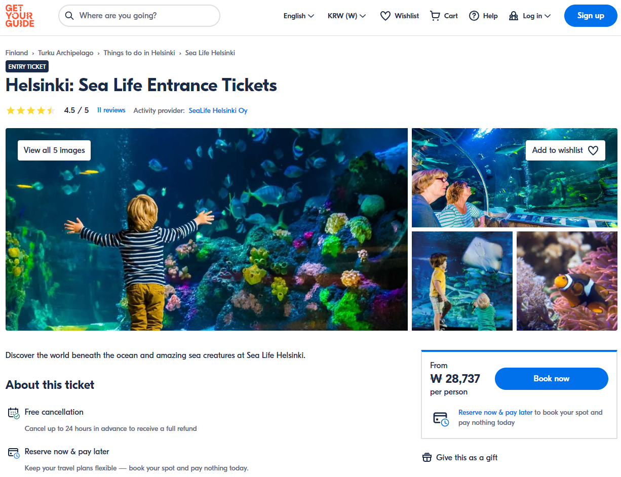 헬싱키 씨라이프(Helsinki Sea Life) 입장권은 GET YOUR GUIDE 사이트에서 예약하실 수 있습니다. 사이트는 특히 전세계 대부분의 나라, 지역의 투어, 교통편 있어, 쉽게 찾을 수 없는 여행지의 다양한 투어 및 서비스를 이용할 수 있는 글로벌 사이트로 한국어사이트는 지원하지 않습니다. (글로벌 한국어 여행사이트를 찾으신다면 klook 여행사이트 추천합니다. 함께 사용하시면 더욱 편하게 여행하실 수 있습니다. klook에 찾는 정보가 없다면 GET YOUR GUIDE에서 찾으시면 됩니다.)