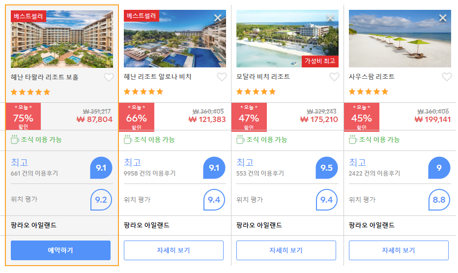 헤난 타왈라 리조트 보홀 (Henann Tawala Resort Bohol)의 최저 가격대는 아고다웹사이트에서 할인특가 가격으로 매일매일 변동되며 10만원대부터 다양하게 형성됩니다. 날짜별로 매일 가격이 다르므로 아고다웹사이트 최저가를 확인하시려면 아래 링크를 누르시고 원하는 날짜의 가격대를 선택해야 정확한 가격을 자세히 보실 수 있습니다.