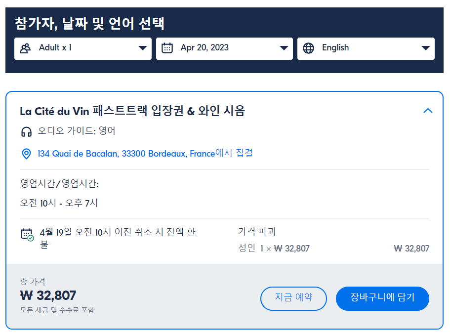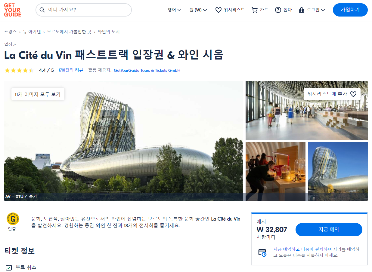 보르도의 La Cité du Vin 패스트트랙 입장권 & 와인 시음 패키지는 GET YOUR GUIDE 사이트에서 예약하실 수 있습니다. 사이트는 특히 전세계 대부분의 나라, 지역의 투어, 교통편 있어, 쉽게 찾을 수 없는 여행지의 다양한 투어 및 서비스를 이용할 수 있는 글로벌 사이트로 한국어사이트는 지원하지 않습니다. (글로벌 한국어 여행사이트를 찾으신다면 klook 여행사이트 추천합니다. 함께 사용하시면 더욱 편하게 여행하실 수 있습니다. klook에 찾는 정보가 없다면 GET YOUR GUIDE에서 찾으시면 됩니다.)