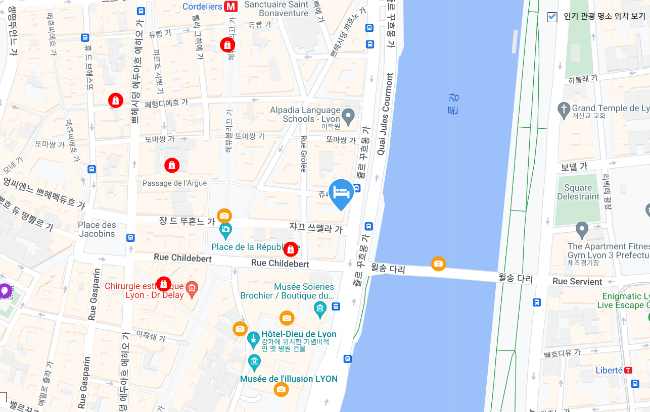 또한, 이 지역은 리옹의 중심부에 위치해 있어, 다양한 관광 명소를 쉽게 방문할 수 있습니다. 예를 들어, 장바빌리에 광장(Place Bellecour), 리옹 오페라 하우스, 산트 장성당(Basilica of Saint-Jean) 등이 가까운 거리에 위치해 있습니다.