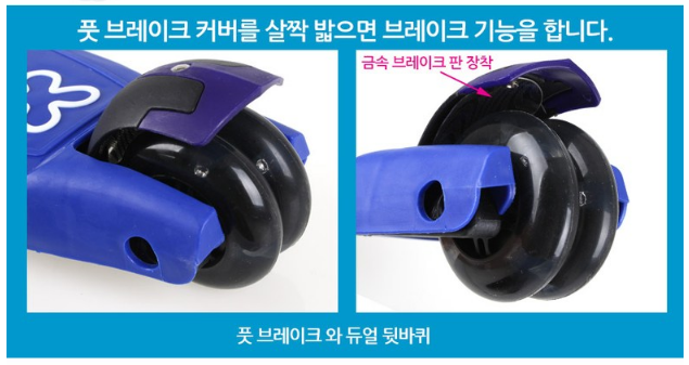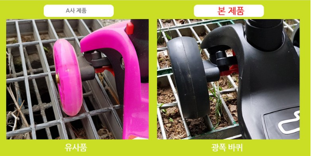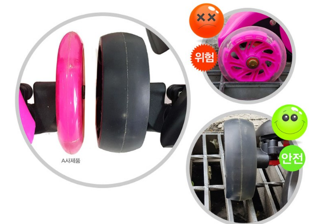 기존 킥보드의 바퀴는 폭이 좁아 하수구 철망이나 보도블럭의 작은 홈 등에 바퀴가 끼여 넘어지는 경우가 있습니다.