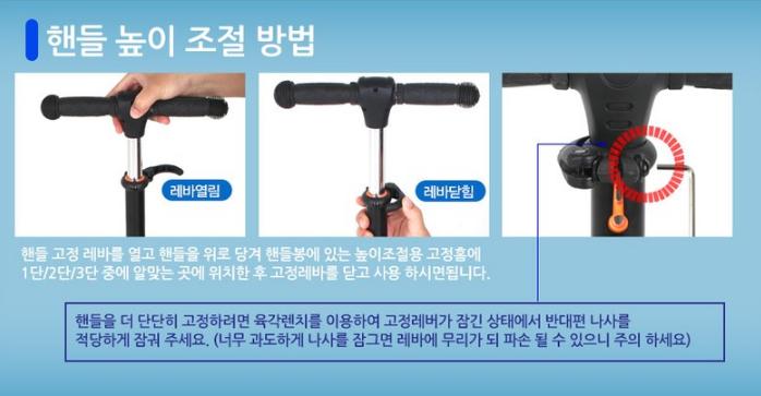 핸들 고정 레바를 열고 핸들을 위로 당겨 핸들봉에 있는 높이조절용 고정홈에 1단/2단/3단 중에 알맞는 곳에 위치한 후 고정레바를 닫고 사용 하시면됩니다.