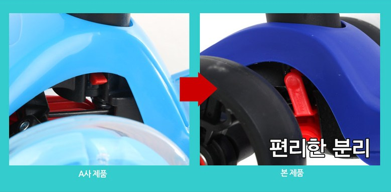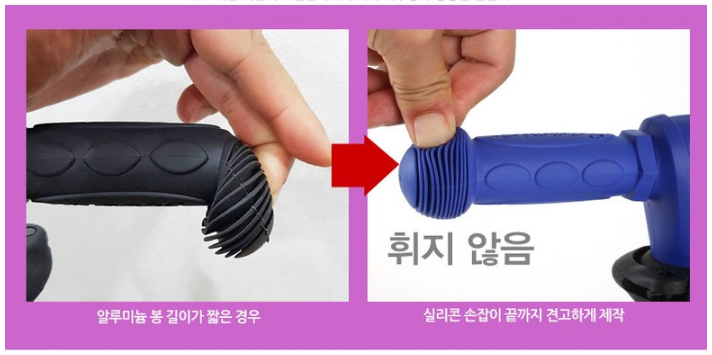일부 제품은 알루미늄 핸들이 짧은데 실리콘 손잡이만 바로 끼워 실리콘 손잡이 끝부분이 힘이 없이 꺽이거나 하여 손잡이를 헛 집어 아이가 넘어지거나 손잡이 끝이 찢어지는 경우가 발생 합니다. 타맥스 모든 제품은 보이지 않는 손잡이 내부에도 꼼꼼히 제작하여 손잡이 끝이 휘어지지 않아 안정적인 그립이 가능하며 손잡이 내구성을 대폭 향상 시켰습니다.