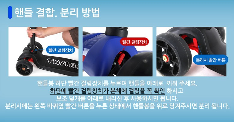핸들봉 하단 빨간 걸림장치를 누르며 핸들을 아래로 끼워 주세요. 하단에 빨간 걸림창치가 본체에 걸림을 꼭 확인 하시고