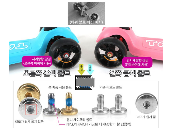 기존에 왼쪽, 오른쪽 바퀴 볼트를 동일한 방향으로 잠기는 볼트를 사용하여 왼쪽바퀴는 지속적인 주행시 볼트가 풀릴 수 있지만